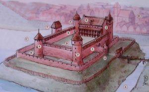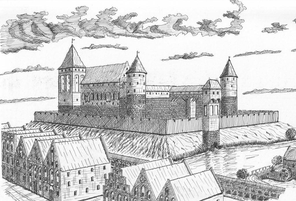 Zamek wzniesiono na planie prostokąta o wymiarach 49×70 metrów z kamieni eratycznych i cegły. W narożach powstały 3 okrągłe baszty (Młyńska, Różana oraz Polna) i jedna kwadratowa wieża (Prochowa) od północy. Przy skrzydle północno-zachodnim postawiono trzypiętrowy, podpiwniczony dom mieszkalny („Dom Zakonny”) o wymiarach 13 x 39 metrów. W budynku tym znajdowały się najważniejsze pomieszczenia, takie jak refektarz, kaplica i mieszkanie prokuratora. Na najwyższej kondygnacji mieściły się magazyny. Przy skrzydle południowo-zachodnim zbudowano piętrową kuchnię z magazynem żywności. W jej sąsiedztwie znajdowała się studnia. Brama wjazdowa została wzniesiona od strony północno-wschodniej. Przed bramą wjazdową wykopano fosę, nad którą przerzucono most zwodzony. W narożnikach skrzydeł znajdowały się potężne baszty i wieża. Warownia pozwalała zastosować do obrony broń palną, co było ówcześnie novum. W zamku na stałe przebywało od kilku do kilkunastu rycerzy zakonnych wraz z giermkami i knechtami. Pełna załoga zamku składała się z kilkudziesięciu osób.