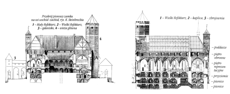 Przedzamcze , Pomieszczenia reprezentacyjne, Kaplica zamkowa, Wielki refektarz, Pomieszczenia wieży wysokiej, Komnata audiencyjna i pozostałe pomieszczenia pierwszego piętra.