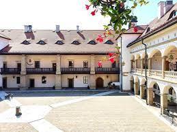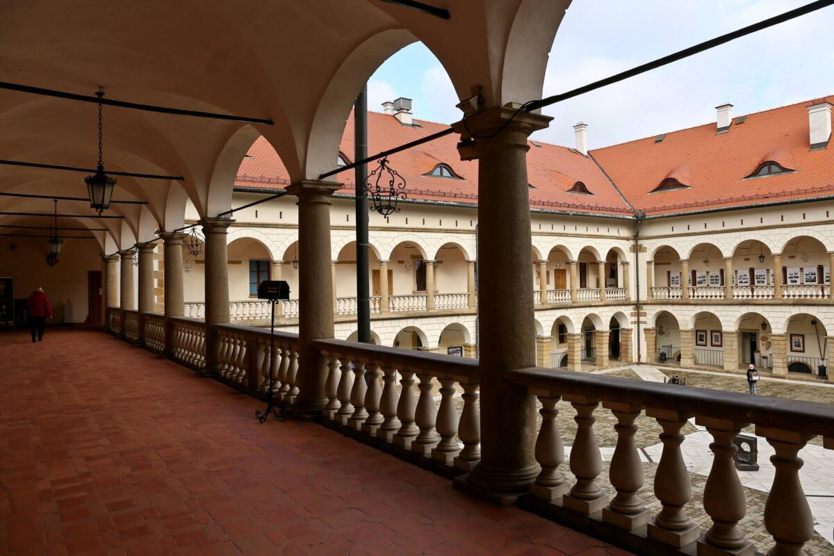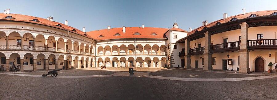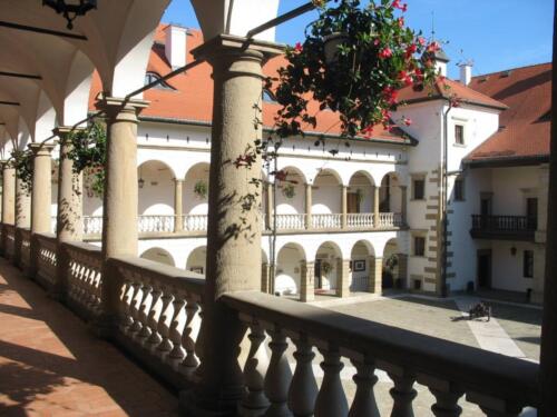 Arkady i dziedzińce: Wewnętrzne dziedzińce zamku są otoczone arkadami i krużgankami, co tworzy spójny i piękny układ przestrzenny. Arkady są zdobione detalami w stylu renesansowym.