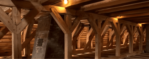 Więźbę dachową wykonano łącznie z najwyższą kondygnacją skrzydła południowego, zaopatrzoną w nadwieszoną nad zewnętrznym murem, drewnianą hurdycję o konstrukcji szkieletowej. Słupy zewnętrznej i wewnętrznej ściany szkieletowej hurdycji zostały stężone z wiązarami więźby dachowej mieczami omocnych złączach na nakładkę zaczepową, a obydwie konstrukcje oznakowano jednolitym, rozbudowanym systemem ciesielskich znaków montażowych, który zachował się do naszych czasów w stanie niemal kompletnym.