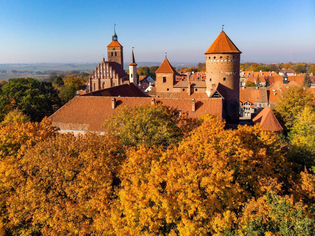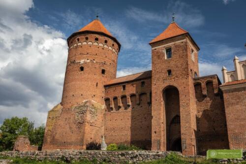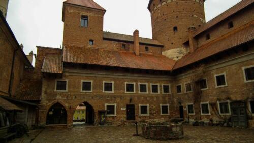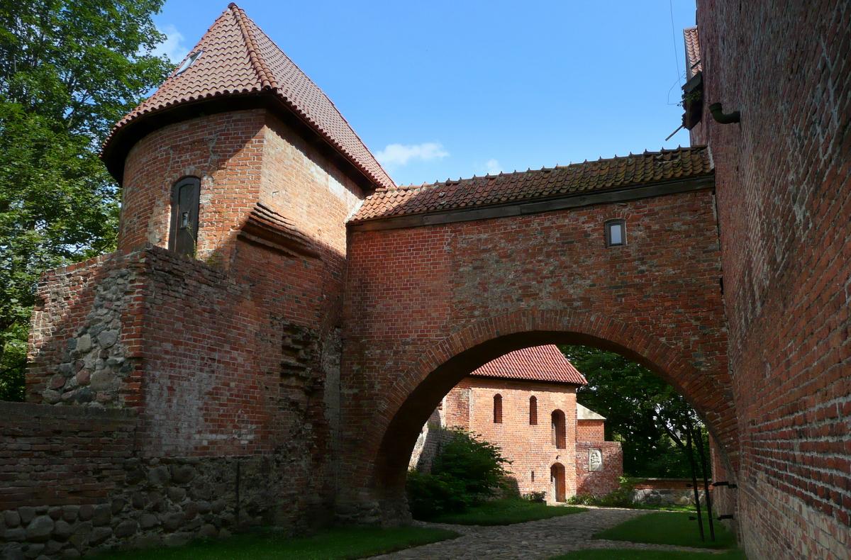 Mur Obronny: Zamek otoczony jest potężnymi murami obronnymi, które w średniowieczu stanowiły główną linię obrony przed nieprzyjacielem. Mury te, wykonane z cegły i kamienia, miały za zadanie zabezpieczyć wnętrze zamku przed atakami z zewnątrz. Wysokość i grubość murów świadczy o ich pierwotnym, obronnym charakterze.