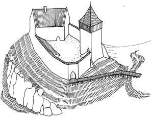 Pierwotny zrąb zamku tworzył prostokątny dziedziniec, otoczony grubymi murami kurtynowymi z kamienia łamanego. Serce warowni stanowił masywny donżon – czworoboczna wieża mieszkalno-obronna o grubych murach i wąskich, strzelniczych oknach. Donżon był najwyższą i najważniejszą strukturą w zamku: mieścił pomieszczenia mieszkalne właściciela, a w razie oblężenia stawał się ostatnim punktem obrony. W jego niższych kondygnacjach znajdowały się spiżarnie i magazyny, wyższe służyły celom reprezentacyjnym i mieszkalnym. Pomieszczenia te ogrzewano kamiennymi piecami lub kominkami, co potwierdziły odkrycia podczas prac archeologicznych.